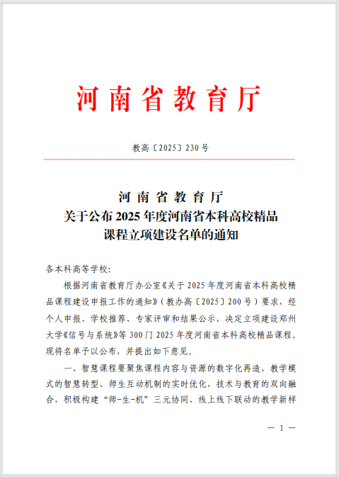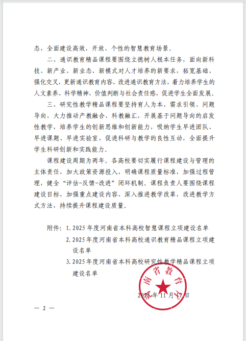 注:河南省教育厅关于公布2025年度河南省本科高校精品课程立项建设名单的文件